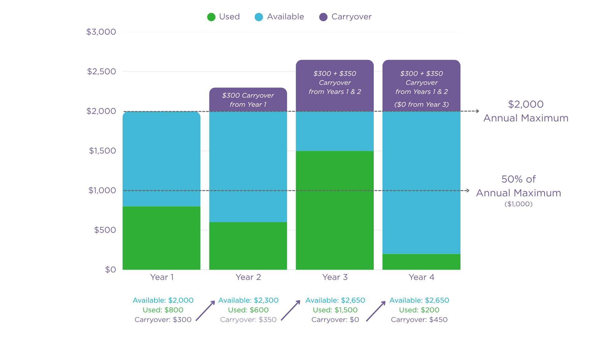 2: You can carry up to $500 in unused dollars into the following year. Unused yearly carryovers can accumulate up to your standard annual maximum.