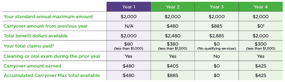 Regular preventive care visits are encouraged; the simple act of visiting your dentist activates Carryover Max benefits.